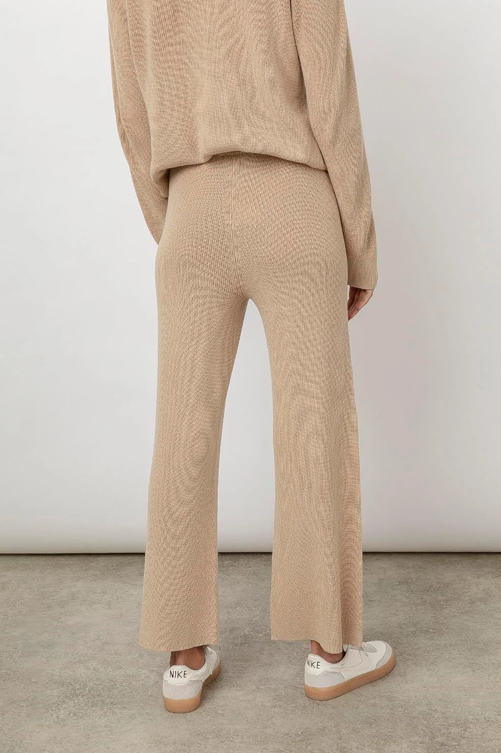 Super soft, cotton cashmere, high rise, sand beige lounge pants featuring elastic waist with tonal drawcord, ribbed waistband, slim-straight fit, and relaxed leg opening. An ultra cozy, stylish take on loungewear featuring an elevated textural fabrication that looks amazing as a matching set or on its own.
