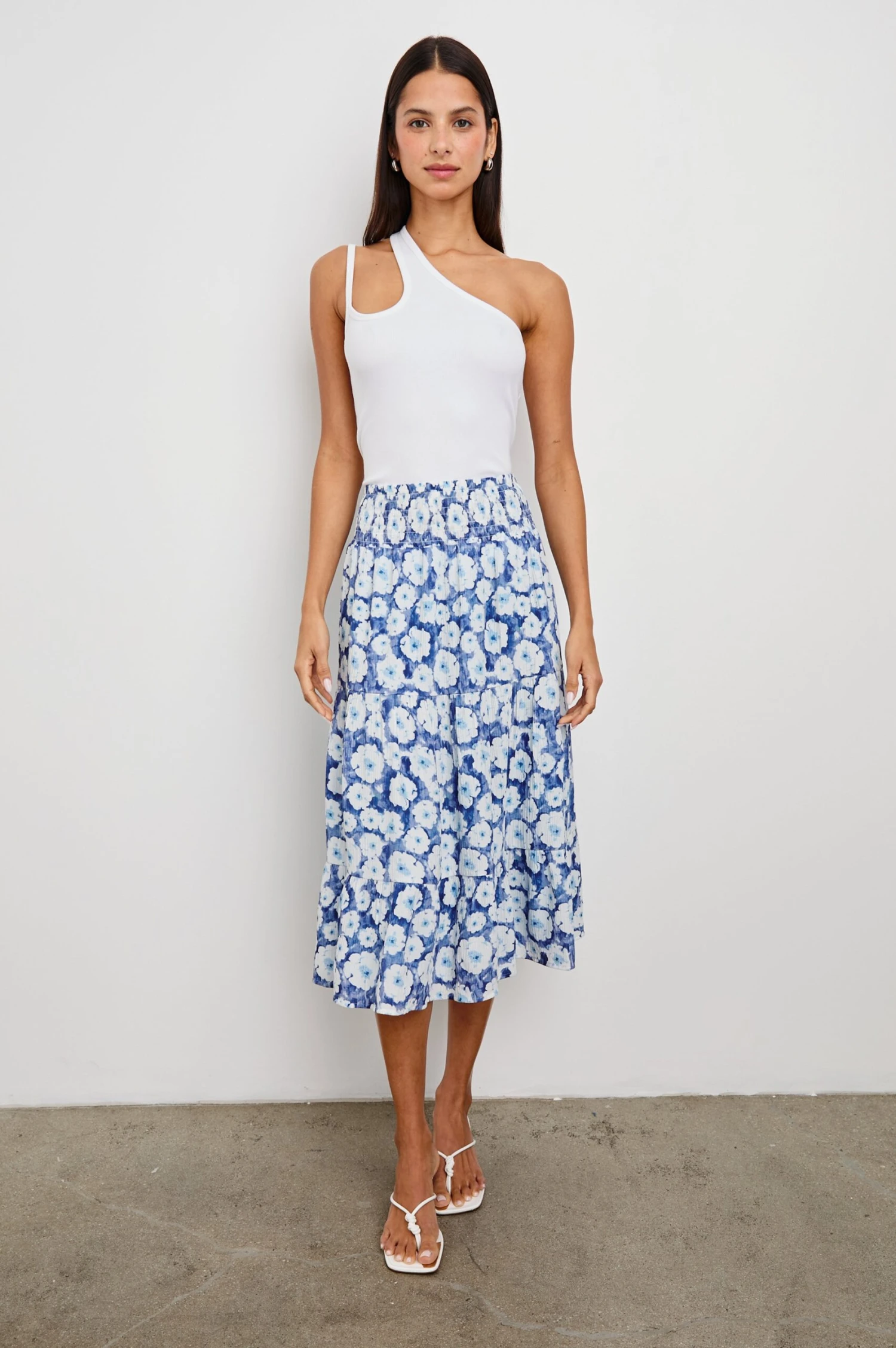 An airy, tiered maxi skirt, the Edina has a shirred high-rise waist and flowing fit. Crafted from lightweight beach cotton, its an essential addition to any warm weather rotation.