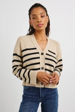 Prepare to make waves in this coastal-inspired cardigan. Featuring a flattering v-neckline, functional button closures, and playful black striping across the bodice and sleeves, this soft knit style is ready to set sail on your next adventure.