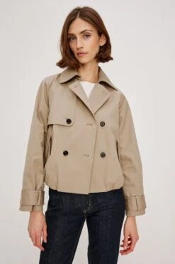 Not your average trench. The Jett is a cropped khaki jacket with a bubble hem, functional pockets, and cuffed sleeves with adjustable snaps to customize the fit.