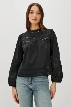 The Reyna is a crewneck babydoll blouse with sheer weaving, ruffled accents, and pintuck detailing at the sleeves. Lightweight and airy, it’s designed for a breezy, relaxed fit.