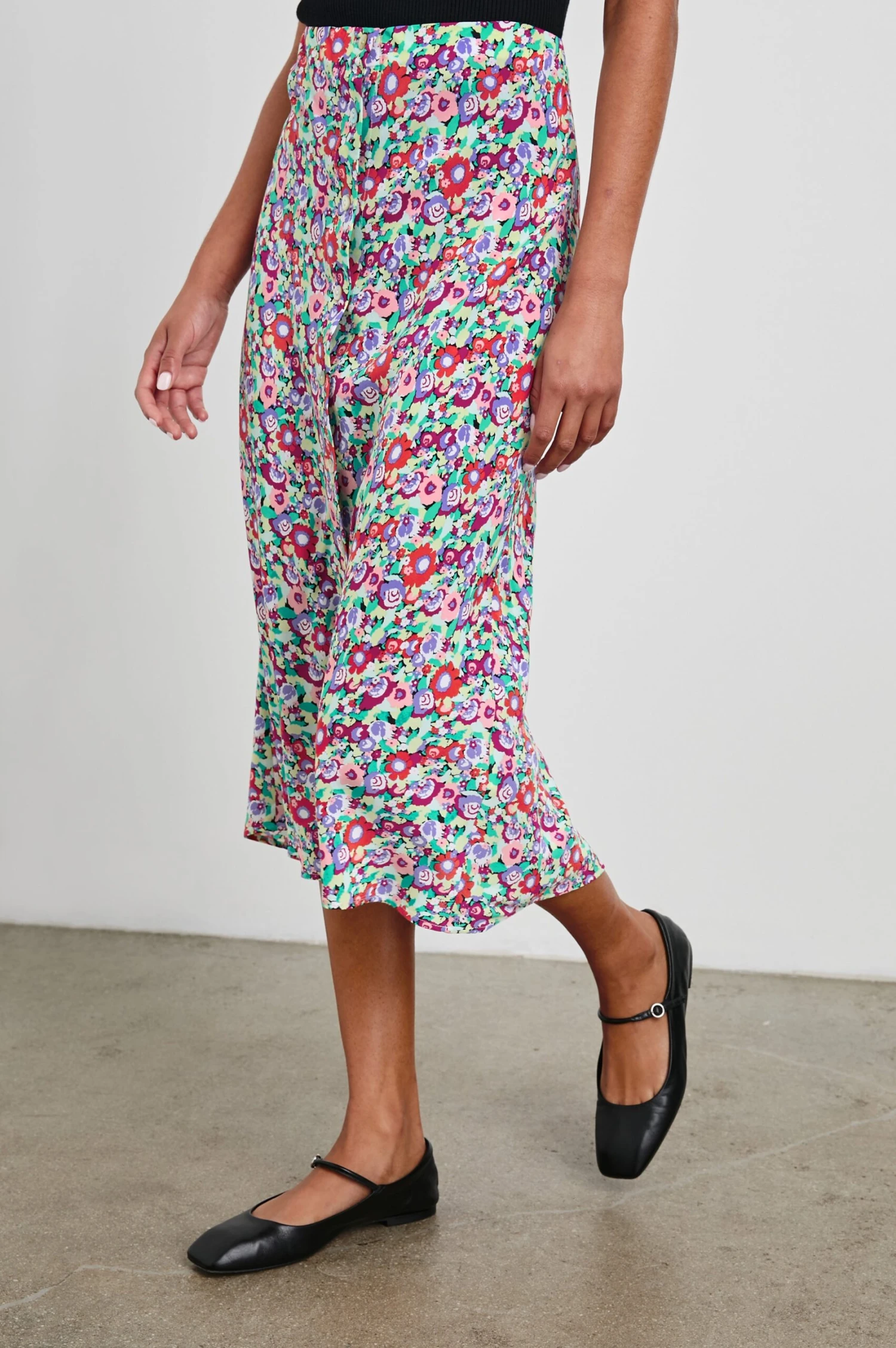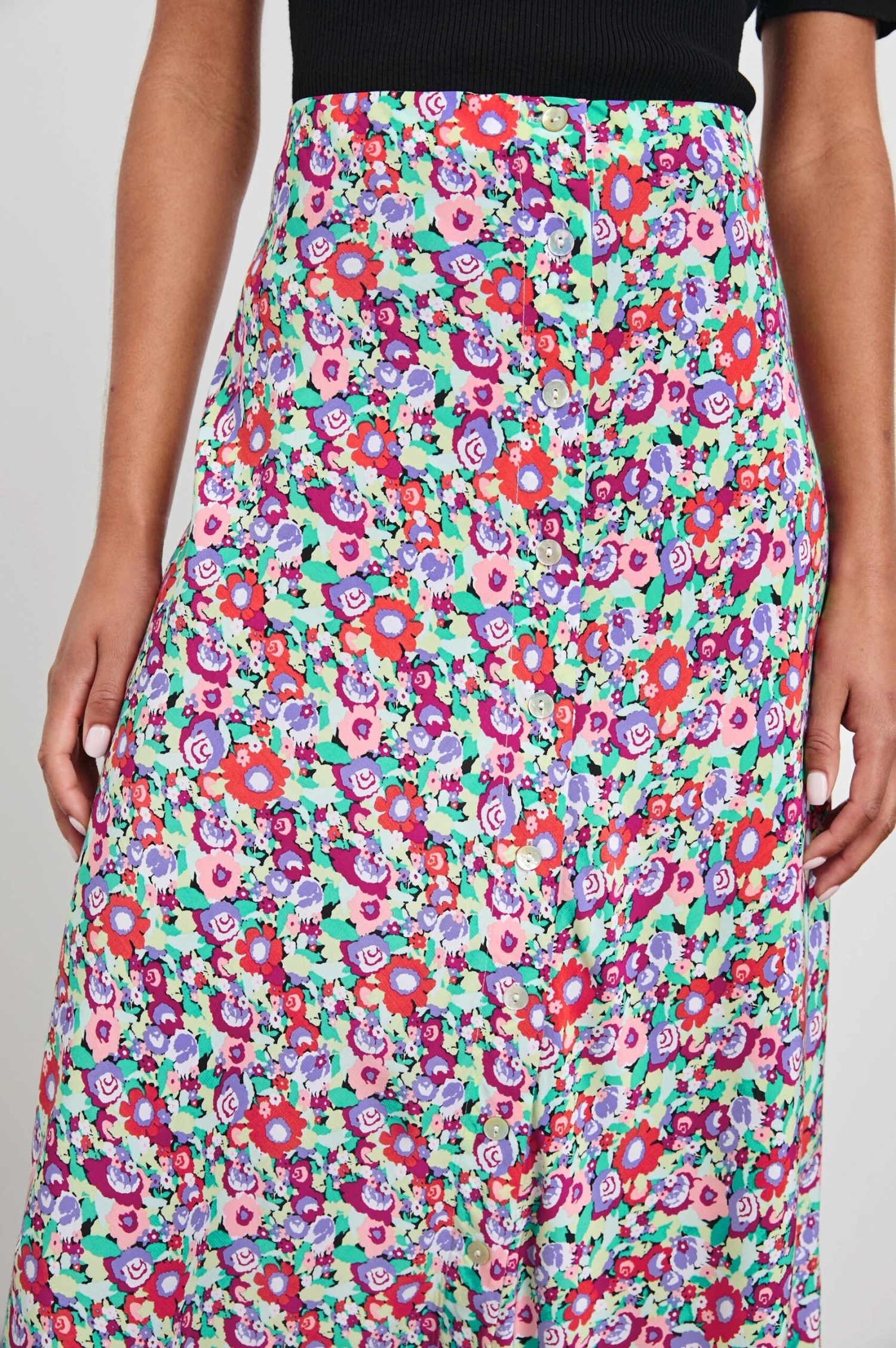 The Rosetta Skirt is adorned in punchy, springtime flowers and features a midi length and hidden elastic at the waist.